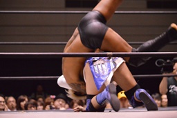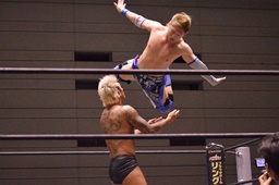 大石スイングDDT、ミラクルエクスタシー、カウント2。コーナーに上ってダイビングクロスボディ(右写真)。
