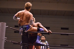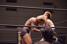 ロープに振ってミドルキック(左写真)、大石は場外エスケープ。坂口追いかけてストンピング、ミドルキック。エプロンPKかわしスイングDDT。