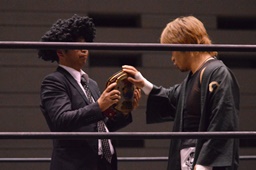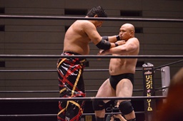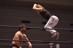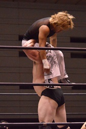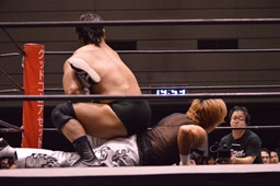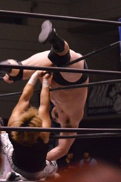 MIKAMIセントーン、カバー、カウント1。コーナーでパンチ連打(右写真)。MIKAMI腕をひねる、岡林切り返す。MIKAMIロープを使って回転、切り返す。岡林ボディスラム、関本にタッチ。