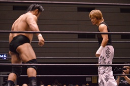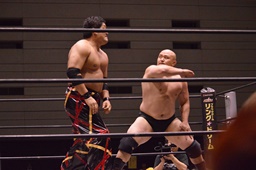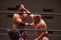 岡林逆水平(右写真)、石川エルボー、ロープに飛ぶ、追走ラリアット、関本にタッチ。