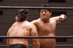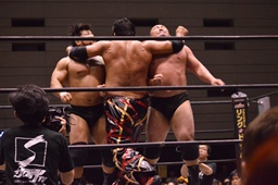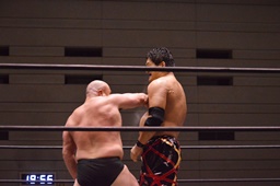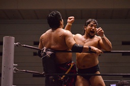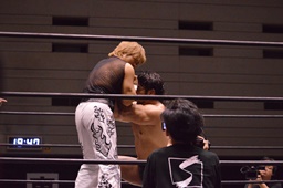 関本はコーナーに押し込む(右写真)、MIKAMIコーナーに上って切り返す、MIKAMI腕をひねってハンマーロック、関本切り返してヘッドロックからフライングメイヤー、MIKAMIヘッドシザーズ。両軍タッチ。