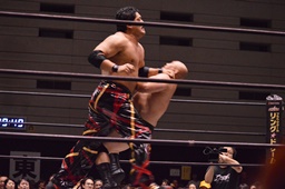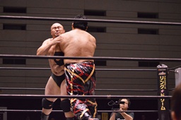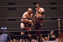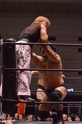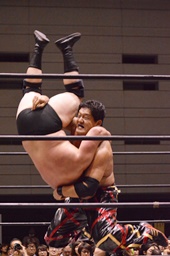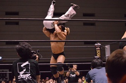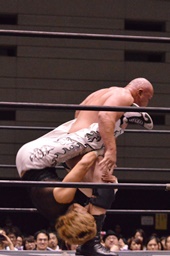 石川ブレーンバスター狙う、岡林ブロック、石川ブレーンバスターはあきらめてツームストーンに(左写真)、カウント2。10分経過。