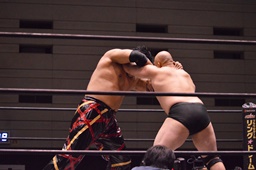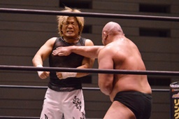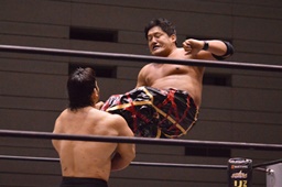 関本串刺しラリアット2連発(左写真)、ブレーンバスター、カウント2。