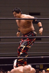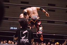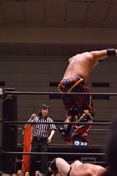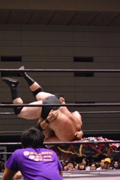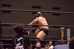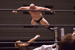 石川ヘッドバット、岡林をコーナーに振って串刺しラリアット、ボディスラムからコーナーに上ってダイビングフットスタンプ(右写真)、カウント2。