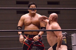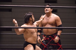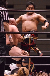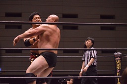 関本エルボー、首投げからエルボードロップ(左写真)、カウント2。スリーパー、MIKAMIロープ。関本は岡林にタッチ。5分経過。