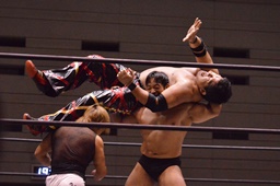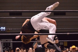 MIKAMIラダーに上る、岡林も上る、MIKAMI落とす。岡林はラダーの下に潜り込んで、MIKAMIごとバックフリップで投げる(右写真)。なんてことを・・・。MIKAMIは石川にタッチ。15分経過。