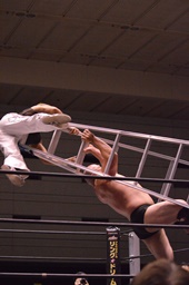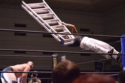 MIKAMI岡林をリングに戻すとラダーを持ち込み、コーナーに上って雪崩式ブレーンバスターで岡林に投げつける(左写真)。カバー、カウント2。岡林をラダーに振る、岡林切り返す、MIKAMIラダーに飛び乗ってムーンサルトアタック、カウント2。