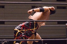 岡林パワーボム狙う、MIKAMI回転エビ固めに切り返す、岡林ブロック(右写真)。