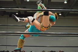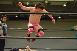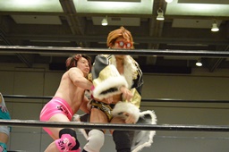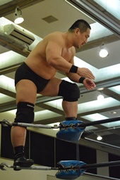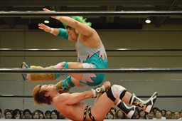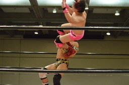 高木ブレーンバスター狙う、入江ブロックしてジャンピングブレーンバスター(右写真)、カウント2。