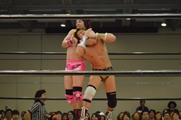 高木ぶっこ抜き雪崩式ブレーンバスター(右写真)、カウント2。平田がタッチを要求、高木応じる。