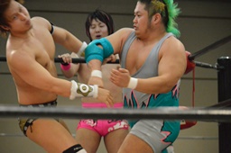 平田が座り込む(右写真)、レフェリーのチェック入るが3回目で立ち上がりロープ。石井は入江にタッチ。