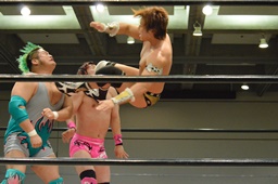 2人にドロップキック(右写真)、場外に落とす。