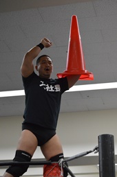 大社長が腕にカラーコーンつけてFire!(右写真)