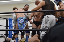 平田が踊りだす前に試合開始。平田が慌ててリングインすると全員で平田にストンピング(左写真)。平田「味方だろ!」→全員でジャンプ。