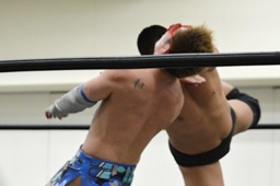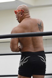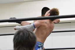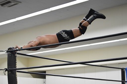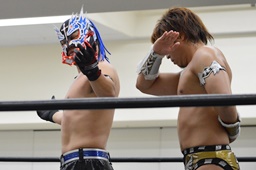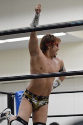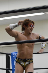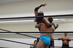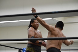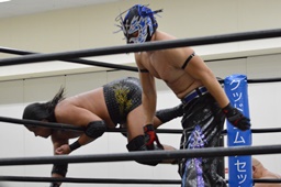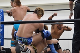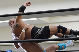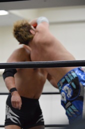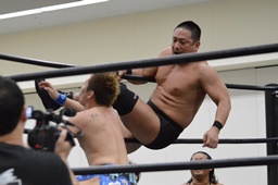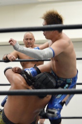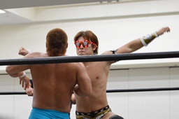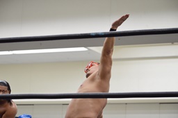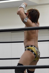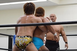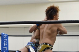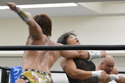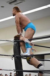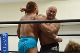 松永相島にバックドロップ(右写真)、相島すぐに立ち上がる。