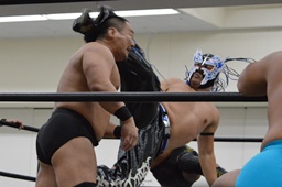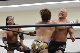 MIKAMIと大石の2人をコーナーに振って串刺しラリアット、2人まとめて担ぐと後ろに投げ捨てる(左写真)。