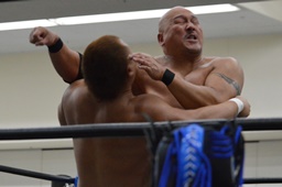 大石キャメルクラッチ(左写真)、平田ロープ。大石エルボー、平田エルボー打ち返す。平田ランニングエルボー、ようやく大鷲にタッチ。