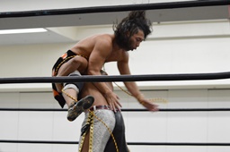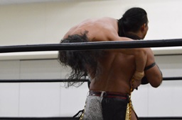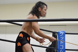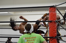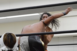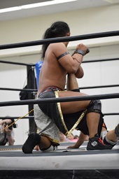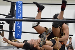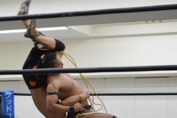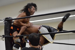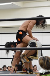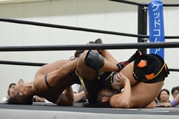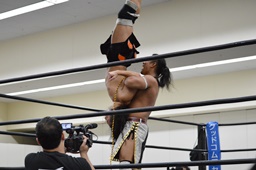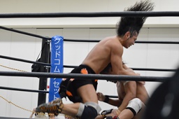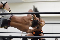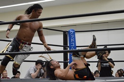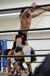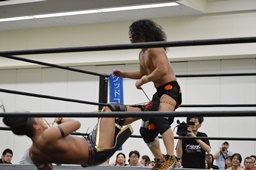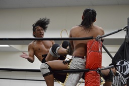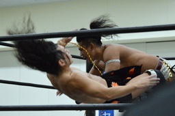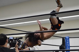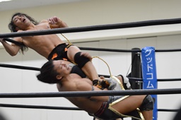 彰人ブロック、高梨ぐるぐるパンチ、彰人かわして低空ドロップキック(右写真)。