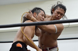 彰人エルボー連打(左写真)、高梨もエルボー。