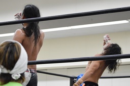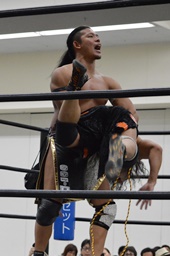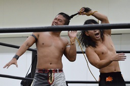 彰人エルボー、高梨低空ドロップキック(左写真)。