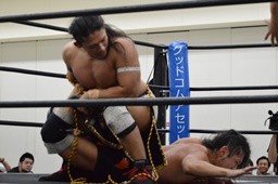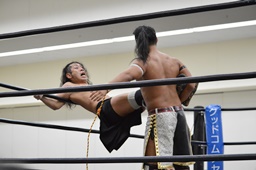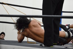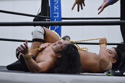 彰人足4の字固め、ブルロープがリングに引っかかった状態だったため高梨はブルロープをたぐってロープエスケープ(左写真)。