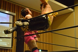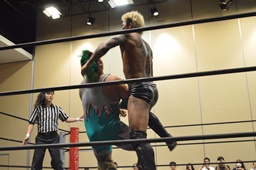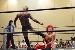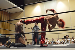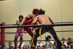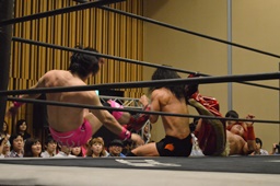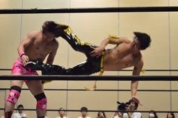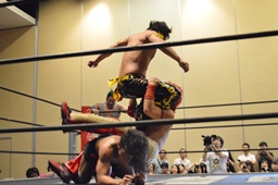 石井チョップ、KUDOエルボーの打ち合い。石井延髄蹴り、高尾にタッチ。高尾コーナーに振る、KUDO切り返して突っ込む、高尾カウンターのキックからコーナーに上って背中にダイビングフットスタンプ。ロープに飛んでドロップキック、カウント2。高尾コーナーに上る、高梨入って高尾を引き摺り下ろして固定、そこにKUDOがダイビングダブルニーアタック(左写真)、カウント2。