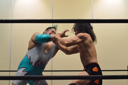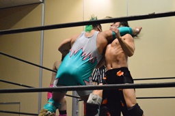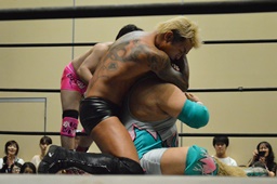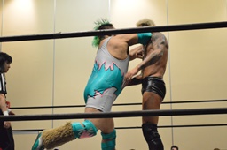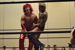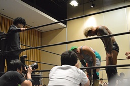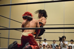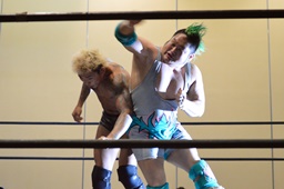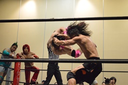 高尾がバック取る、KUDO切り返す。高尾腕を取って切り返しハンマーロックに、KUDO切り返しヘッドロックからフライングメイヤー、高尾ヘッドシザーズ。手四つ、高尾ガットショット(左写真)、石井にタッチ。KUDOも坂口にタッチ。
