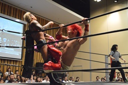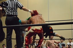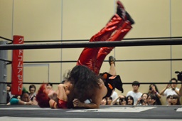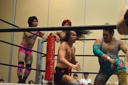 高尾も高梨を入江の頭にぶつけ(右写真)カバー、カウント2。石井にタッチ。石井コーナーに振って串刺しエルボー、高尾にタッチ。5分経過。