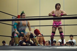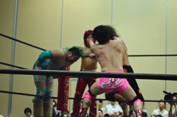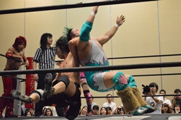 石井キック連打、ロープに振ってドロップキック、カウント2。石井が高梨を入江の頭にぶつけ(左写真)高尾にタッチ。