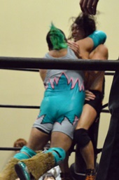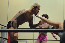 高尾コーナーに詰めて逆水平、ボディスラム、カウント2。入江にタッチ。入江はスティンキーフェース(左写真)。