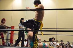 レッグラリアット(右写真)。高尾タカタニックをブロック、そこに石井がニールキック、高梨かわす。