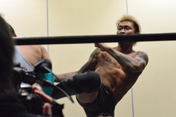 石井ジャンピングニー、ロープに飛ぶ、坂口カウンターのドロップキック、KUDOにタッチ。KUDO延髄蹴り(右写真)、