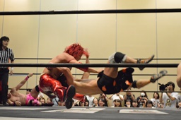 エプロンに出してサンドイッチドロップキック(右写真)、石井リングに戻してカバー、カウント2。入江にタッチ。