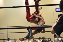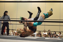 高梨トラースキック、高尾キャッチしてバックスタバー(右写真)、石井が入ってダブルニードロップ。