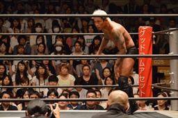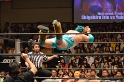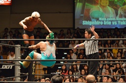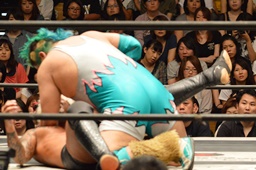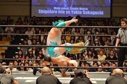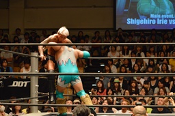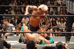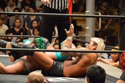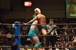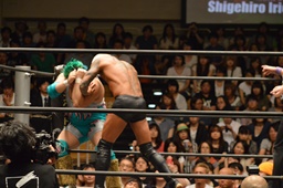 しかし入江は何度落とされてもコーナーに上り、4回目で雪崩式ブレーンバスター(左写真)。