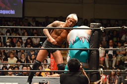坂口パンチ連打、入江防戦一方(左写真)、場外エスケープ。