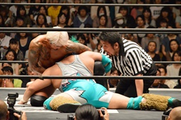 バックドロップの形で坂口をエプロンに叩き付ける(右写真)。