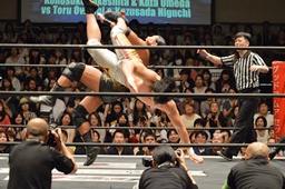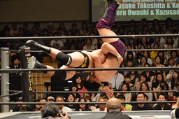 大鷲ブレーンバスターの体勢、梅田ブロックして逆に投げる(左写真)、竹下にタッチ。