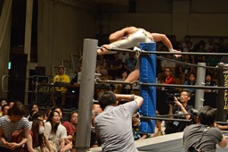 大鷲逆水平、コーナーに振って串刺しラリアット、逆水平(右写真)