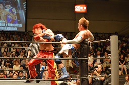大石が高尾をコーナーに振る、高尾切り返して突っ込む、大石カウンターのキック(左写真)