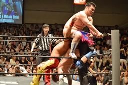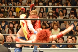 高尾をマットに突き刺し(左写真)、カウント3。