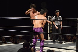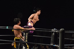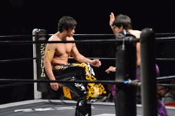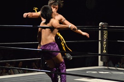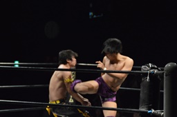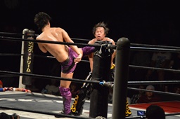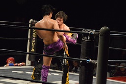 KUDOトペ、梅田エプロンからキック(左写真)。