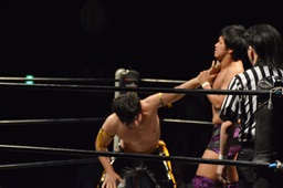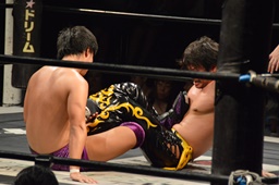 リングに戻すとKUDOはエルボー落としてレッグロック(左写真)、足をロープに引っ掛けて攻める。