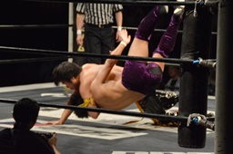 梅田コーナーに戻してミサイルキック(右写真)、カウント2。