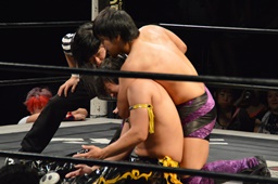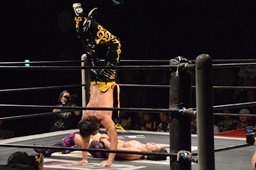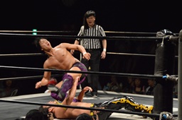 KUDOボディスラムから倒立式ダブルニードロップ(右写真)、カウント2。