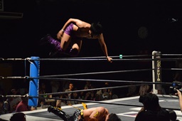 梅田ミサイルキック(左写真)、KUDO場外転落。
