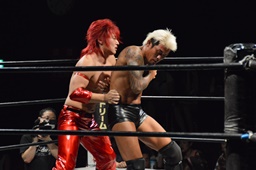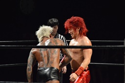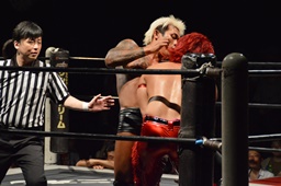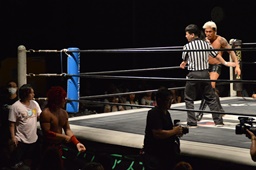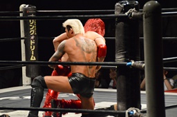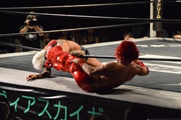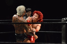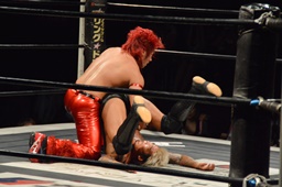 バックドロップ(左写真)、カウント2。10分経過。