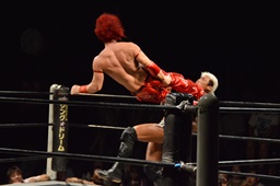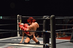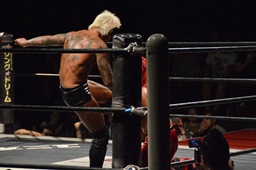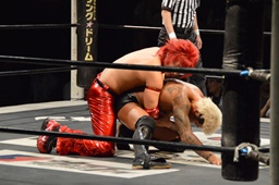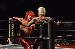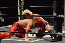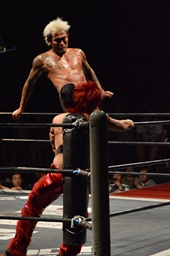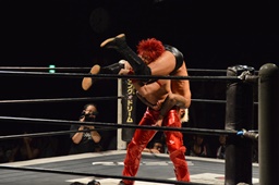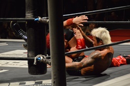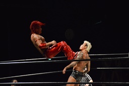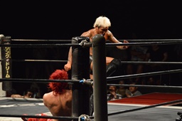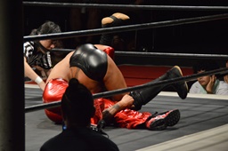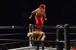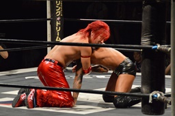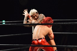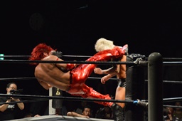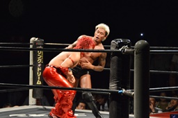 コーナーに上ってミサイルキック(左写真)、カウント2。