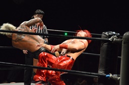 ロープに飛んでドロップキック(右写真)、カウント2。