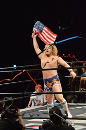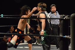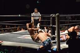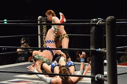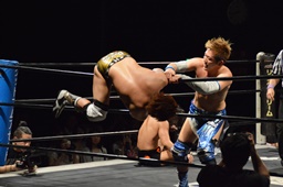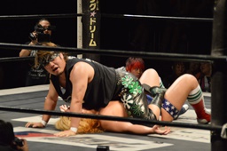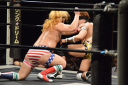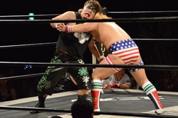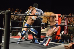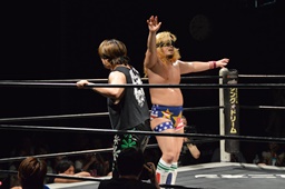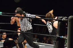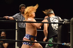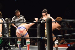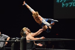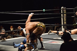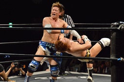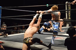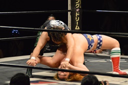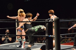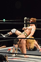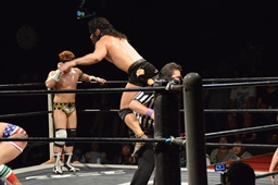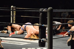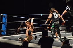 ウラノと高梨が平田をオーバーザトップロープで落とそうとするが、平田はエプロンで踏みとどまる(右写真)。